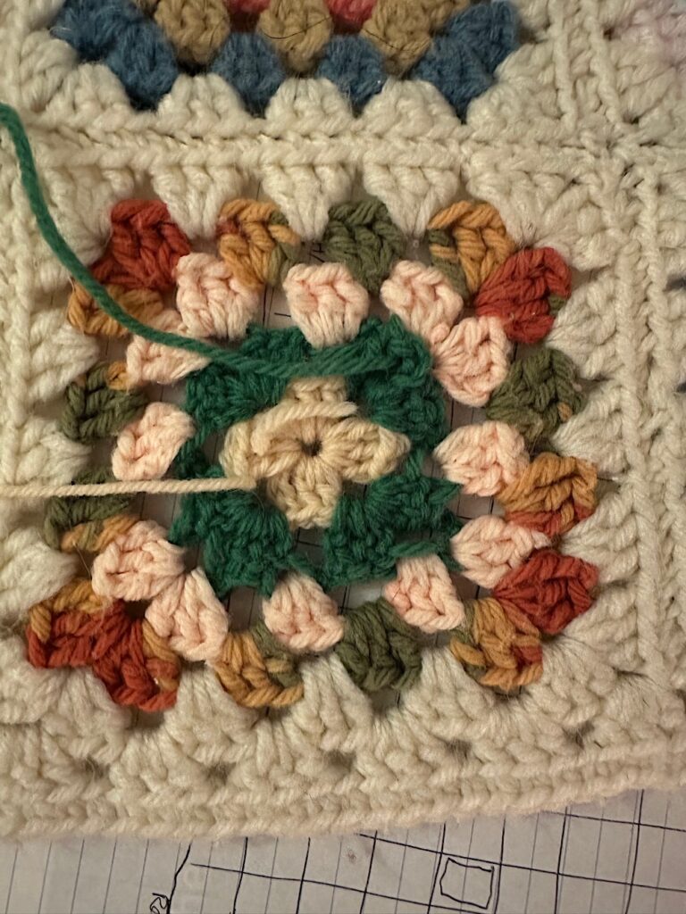 I’m working on granny square repair for my neighbor. I have four blankets to repair! This is the first one. I’m just getting the materials and systems pulled together. First the yarn – I can’t find the exact type of yarn the original blanket used, so I’m making do. The difference is not too noticeable. I finally decided just to repair the parts of the square that are deteriorated, not the whole square. It’s usually the center and maybe the next row as well. So I carefully cut the damaged part out and then crocheted a new one in place, pulling the hook backwards through existing loops to secure it. It’s tricky. Now that I’ve figured out the method, I think I can make better progress. At last count, there are only seven squares to repair on this afghan. I had to make a grid on paper to keep track of my progress – otherwise I found myself looking at everything every time I sat down with it! I’d like to have this one done by Christmas, and the other three can wait for the new year.