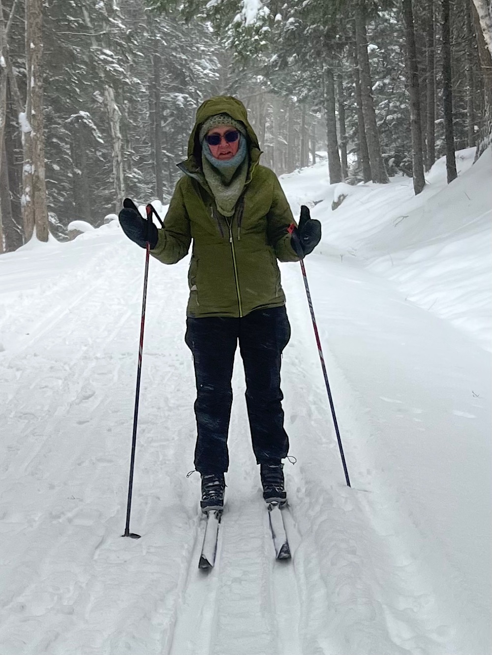 (The odd hand positions are due to my fingers being numb with cold. I was trying to find a way to simultaneously hold my poles and warm up my fingers.)